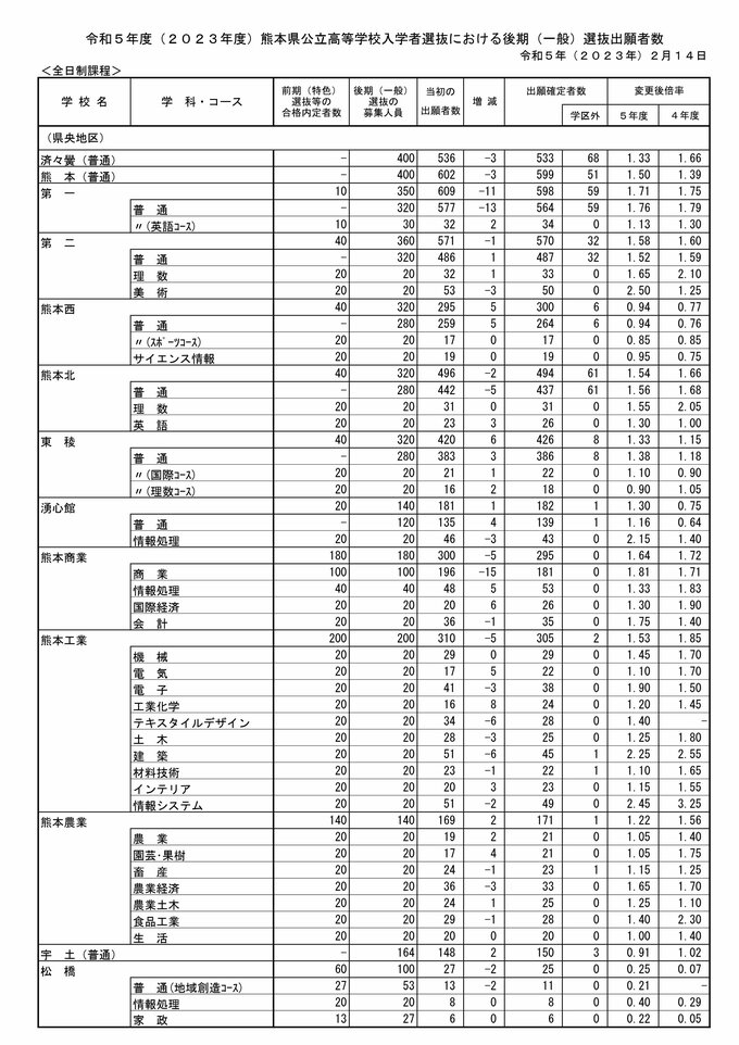 *令和5年度(2023年度)熊本県公立高等学校入学者選抜における後期(一般)選抜出願者数 令和5年(2023年)2月14日 熊本県教育委員会 発表