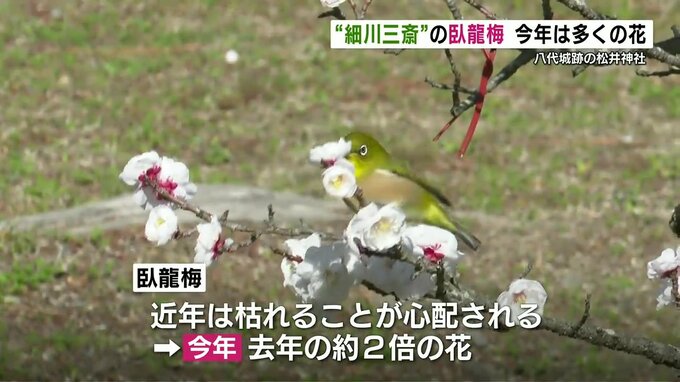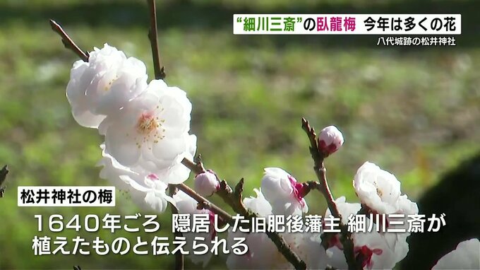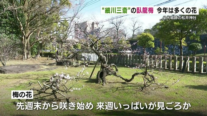 熊本県八代市の神社では、臥龍梅が咲き始め、これから満開の時期を迎えます。