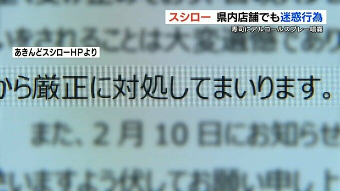 「厳正に対処」スシロー 『熊本の店舗』でも迷惑行為 レーン上の寿司にアルコールスプレー 県教委「事実関係を確認中」 2023年2月25日(土) 12:09 国内 大手回転寿司チェーン「スシロー」を運営するあきんどスシローは、24日、熊本県内の店舗で行われた迷惑行為が行われ、その動画がSNS上で拡散されていると明らかにしました。SNSなどで拡散されている動画は、客とみ…