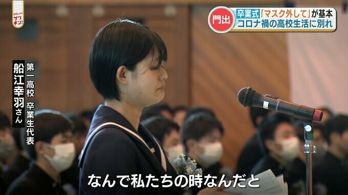 卒業生代表 船江幸羽さん「行事のたびにコロナウイルスの影響で制限がありますがという言葉を使ってきましたがなんで私達のときなんだと」