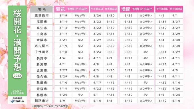 全国で最も早いのは福岡と高知で3月14日の予想です。