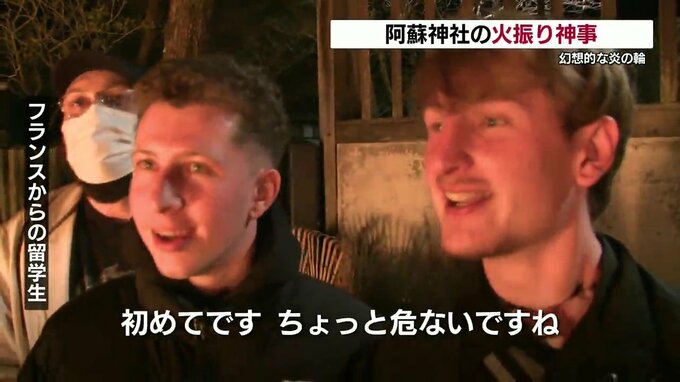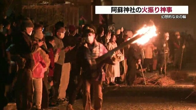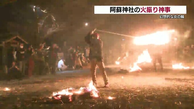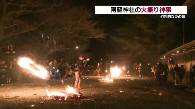 国の重要無形民俗文化財に指定されている阿蘇神社の「火振(ひふ)り神事」が行われ、幻想的な炎の輪が広がりました。