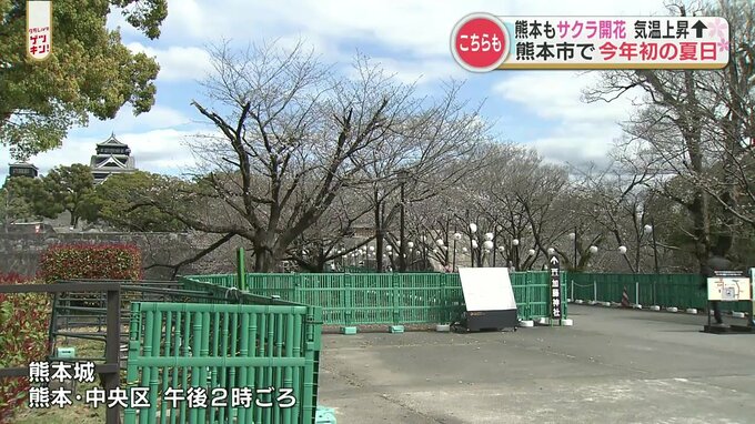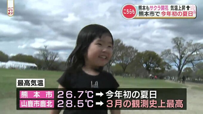 22日の最高気温は熊本市で26.7℃と今年初めての夏日を観測。さらに山鹿市鹿北では28.5℃と3月の観測史上最高を記録しました。