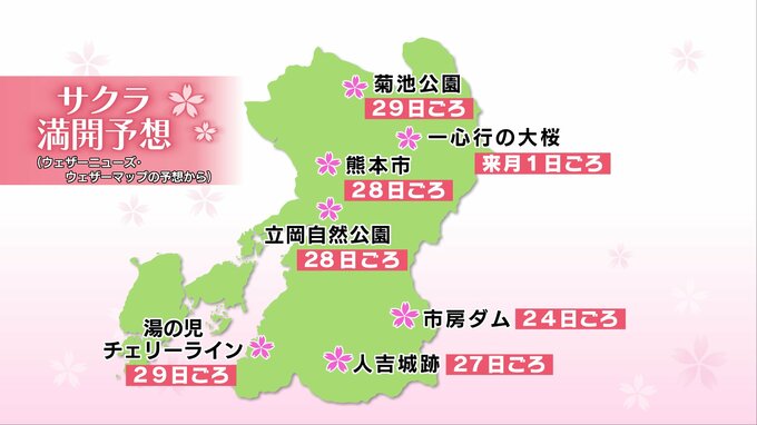 県内各地の満開予想です。気象会社の予想をもとにまとめました。早いのは水上村の市房ダムで今月24日ごろ今週末に見頃を迎えそうです。
