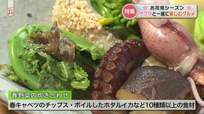 桜景色と懐石料理を求め、半年前から予約する人もいるほど。前菜の炊き合わせには、春キャベツのチップスに、ボイルしたホタルイカなど10種類以上の食材が使われています。ゼンマイのおひたしを春キャベツのチップスと一緒にいただきます。
