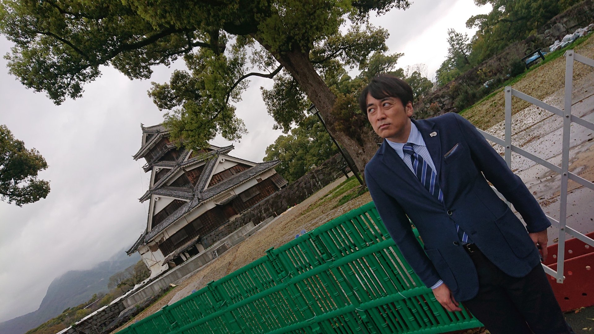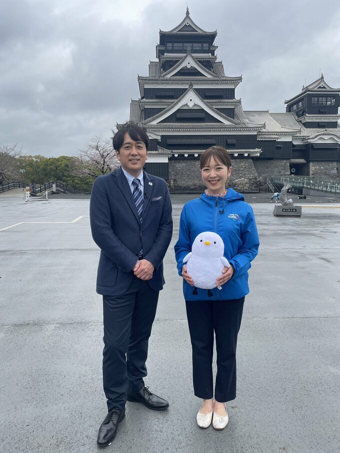 熊本市に戻った安住アナは、「THE TIME,」熊本中継担当の糸永有希アナウンサー(RKK)と熊本城天守閣前で記念撮影。