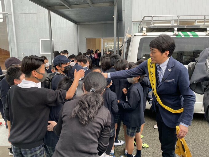 中川英明 校長「わ~、おはようございます。お待ちしておりました。ようこそ山鹿小学校へ」