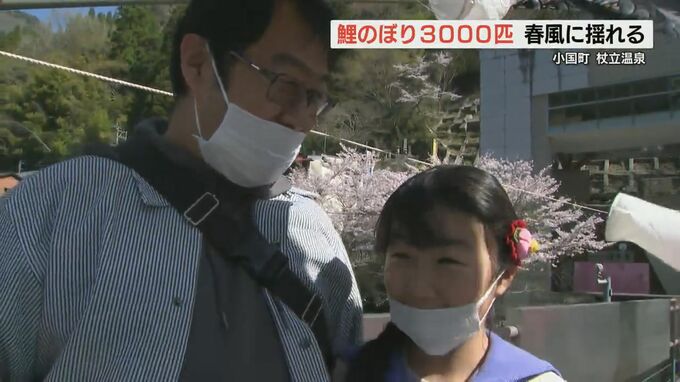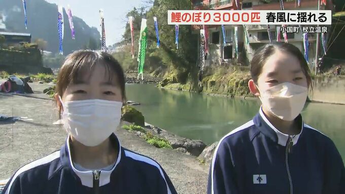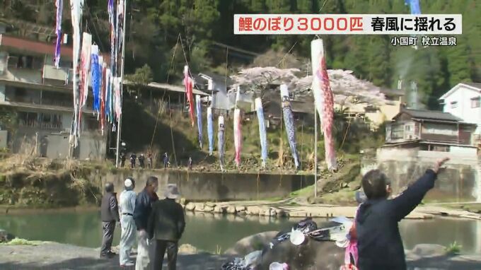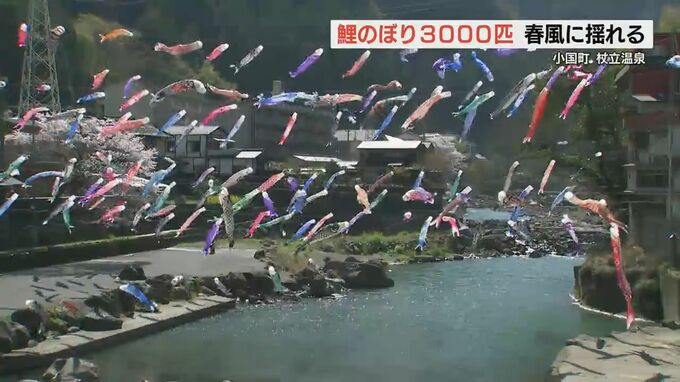 熊本県小国町の杖立温泉で、今年も3000匹を超える鯉のぼりが川の上を泳ぎはじめました。