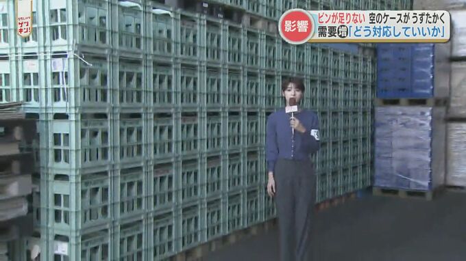 後生川凜アナウンサー「空のまま高く積み上げられたケース。このすべてがビンで埋まるにはしばらく時間がかかりそうです」