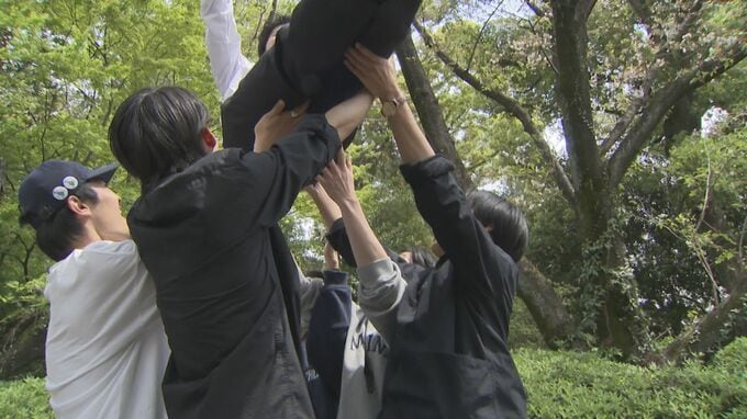 キャンパスに移動した新入生を先輩たちが胴上げし、お祝いする場面も。