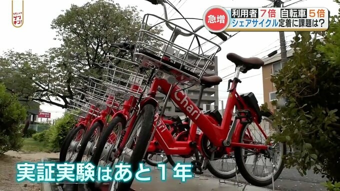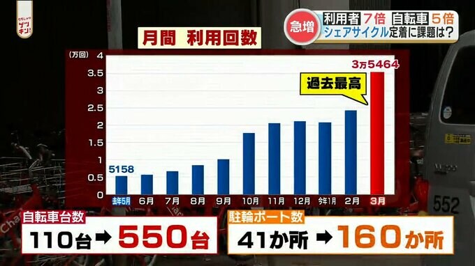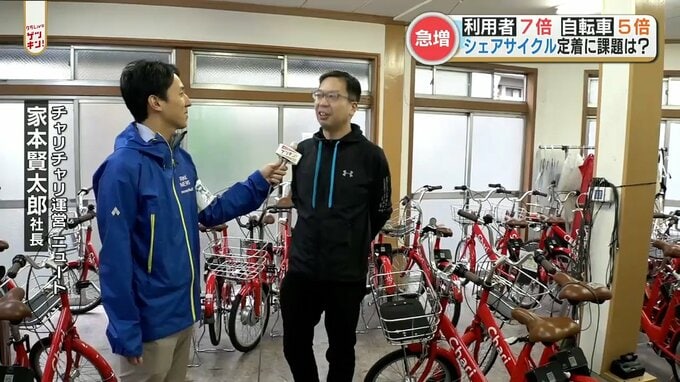 チャリチャリ運営 ニュート 家本賢太郎 社長「利用数でいうと7倍くらいに伸びまして、月の利用数が3万5000回。最初始めた時が月5000回くらいでしたので、ちょうど7倍伸びました」