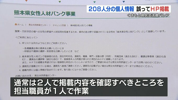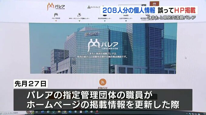 熊本県は「くまもと県民交流館パレア」のホームページ上で誤って208人分の個人情報が掲載されていたことを明らかにしました。