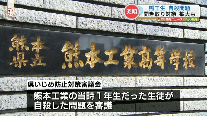 【熊工1年生】自殺の背景について調査結果審議 『聞き取りの対象範囲を広げる可能性』も 2023年4月11日(火) 19:16 国内 2022年10月、当時、熊本工業高校の1年生だった生徒が自殺した問題で、熊本県のいじめ防止対策審議会が開かれました。生徒の自殺の背景について遺族や生徒、教職員などに聞き取りを行なった結果についての分析や、…
