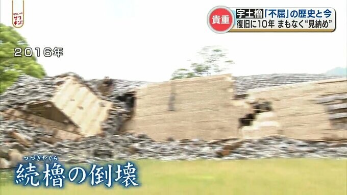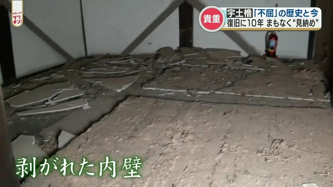 7年前、熊本地震後の宇土櫓。大きな被害は出ていないように見えますが、実は…内壁が剥がれ落ち、床は傾いていました。内部の被害は甚大で、400年以上の間、落ちることがなかった不屈の櫓が、ついに解体されることになりました。
