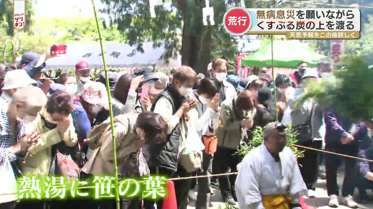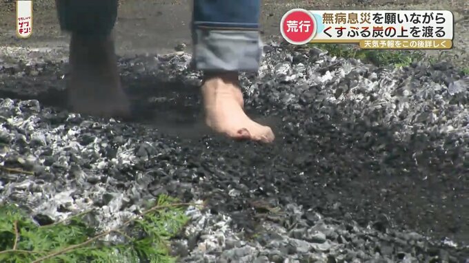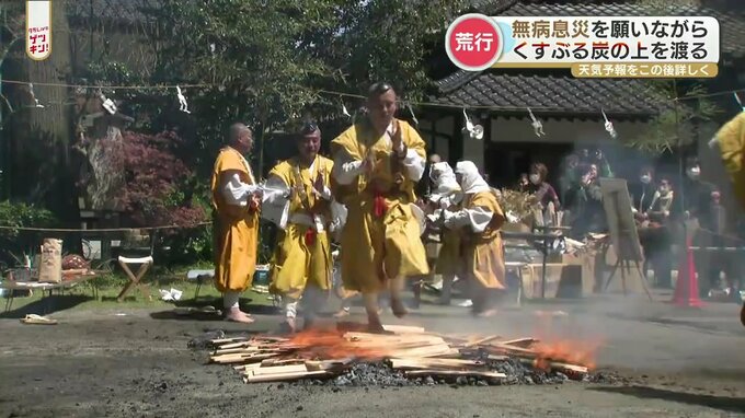 阿蘇市の西厳殿寺(さいがんでんじ)では火渡りの荒行が行われ、参拝者たちの願いが込められた護摩木(ごまぎ)が燃えるなか、修験者姿の行者がお経を唱えながら素足で渡りました。