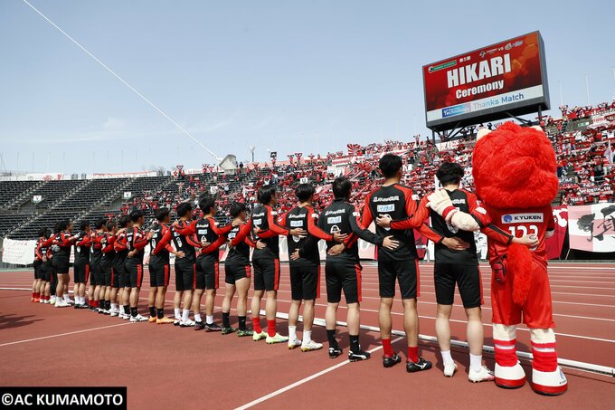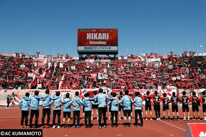 互いに肩を組み横一列に並んだロアッソ熊本の選手たちは、ゴール裏応援席の方を向き耳を澄ます。