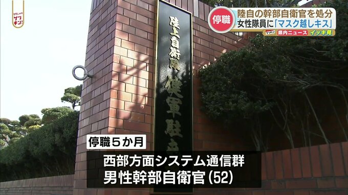 西部方面隊によりますと、幹部自衛官は去年10月、熊本市の飲食店で部下の女性隊員に同意を得ず、マスク越しにキスをしたということです。