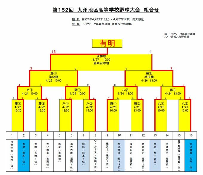 【有明高校 優勝!!】九州地区高校野球大会 「大分舞鶴(大分1位)ー 有明(熊本1位)」 2023年4月27日(木) 12:11 国内 話題・グルメ 第152回 九州地区高等学校野球大会は、4月27日 決勝戦を行い、熊本1位代表の有明と、大分1位代表の大分舞鶴が対決し、16-3で、熊本県代表 有明高校が優勝を果たしました。