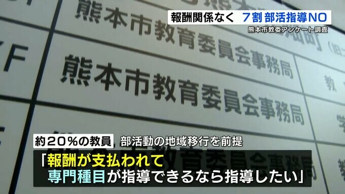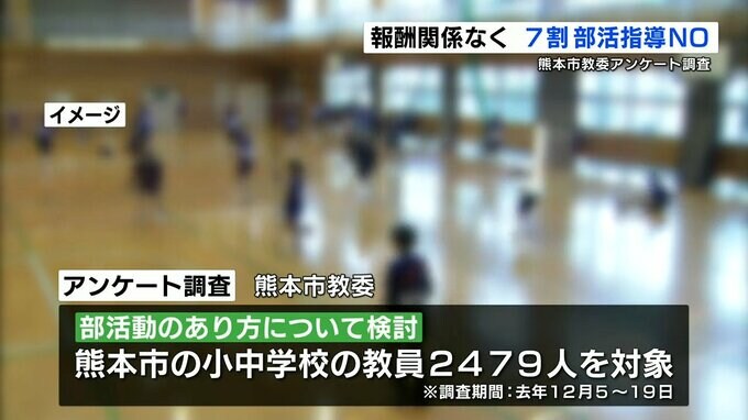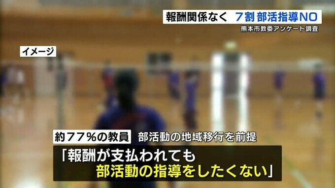 熊本市教育委員会が実施した部活動についてのアンケート調査で、教員の7割以上が「報酬が支払われても、部活動指導はしたくない」と回答していたことが明らかになりました。