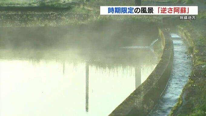 平野部よりも1か月ほど早く田植えの準備が始まる阿蘇地方で、水田が水鏡となって、風の弱い晴れた日の早朝に見られます。