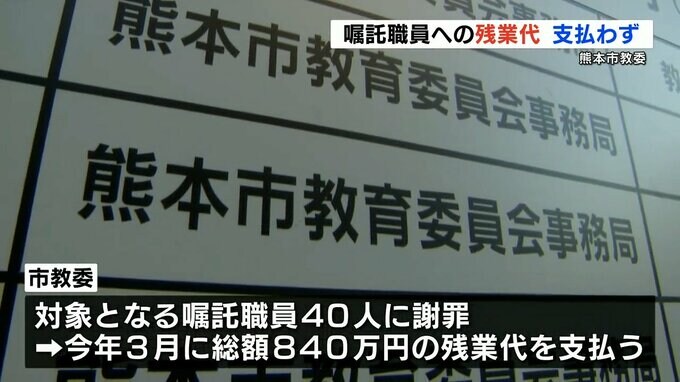 熊本市教委は対象となる40人に謝罪したうえで、2023年3月に残業代を支払いました。