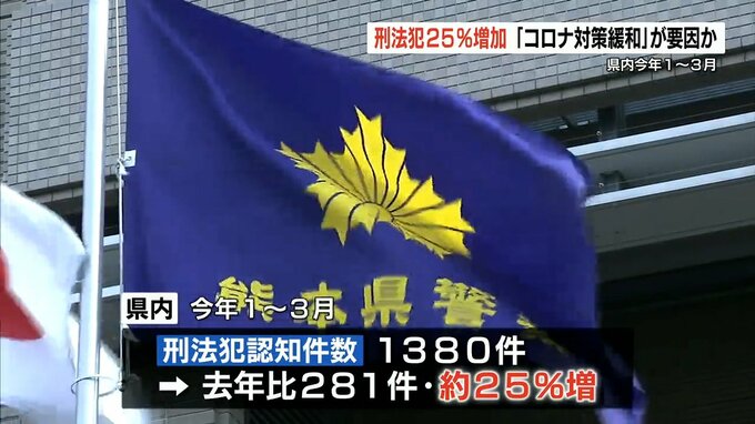 熊本県警によりますと、今年1月から3月末までの刑法犯認知件数は、1380件と去年の同じ時期に比べて281件、約25%増えています。