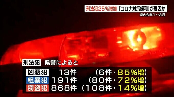 このうち殺人や放火などの凶悪犯が13件と6件増加(85%増加)し、暴行や傷害などの粗暴犯や窃盗犯もそれぞれ増加しています。