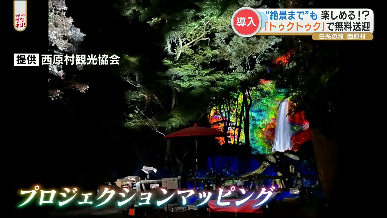 大型連休中はプロジェクションマッピングも楽しめる白糸の滝。トゥクトゥクも毎日運行しています。