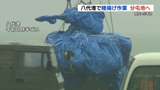 【陸自ヘリ】陸揚げ作業 強い雨の中、高遊原分屯地へ 熊本 2023年5月7日(日) 11:12 国内 沖縄県で起きた陸上自衛隊のヘリコプターの事故で、海底から引き揚げられ八代港に運ばれた機体の主要部分の陸揚げ作業が始まりました。記者「午前8時半です、機体の一部を包んだと思われるブルーシートがゆっくり…