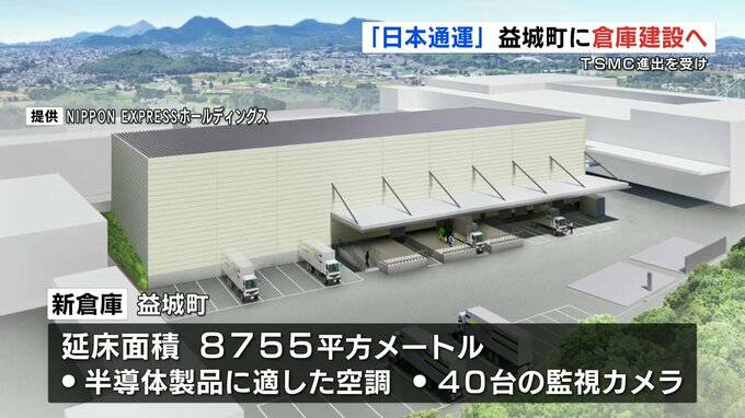 物流大手「日本通運」を傘下に置くNIPPON EXPRESS(ニッポン・エクスプレス)ホールディングスによりますと、益城町に新たに建設される倉庫は延床面積が8755平方メートルで半導体製品に適した空調が整備され、40台の監視カメラを設置し、セキュリティにも力を入れています。