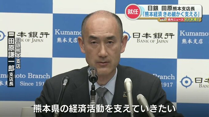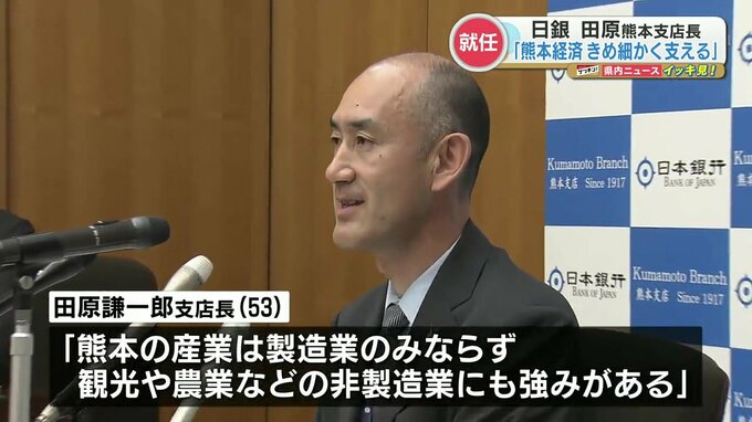 田原支店長は、12日に行われた就任会見で「熊本の産業は製造業のみならず、観光や農業などの非製造業にも強みがある」とし、「今後は県内産業の動向を注視して、地元経済をきめ細かくフォローしていきたい」と抱負を述べました。