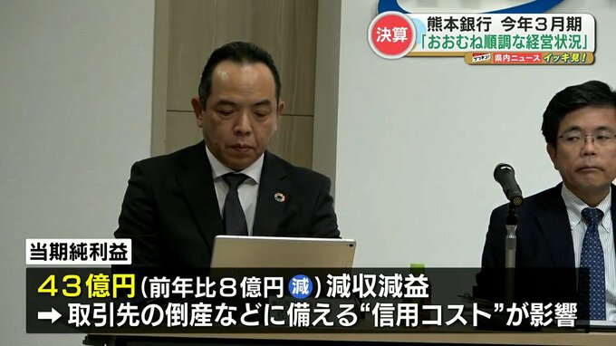 最終的な「当期純利益」は、去年より8億円少ない43億円で減収減益となりました。熊本銀行は取引先の倒産などに備えるための「信用コスト」を多く確保した影響としています。