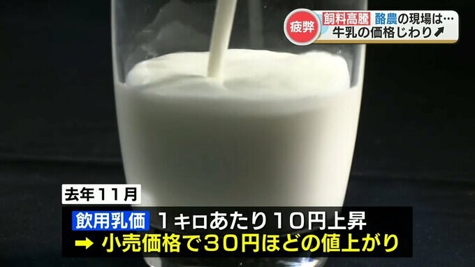 去年11月、農家が乳業メーカーに販売する飲用乳価(いんようにゅうか)は1キロあたり10円上昇。小売価格では30円ほどの値上がりです。
