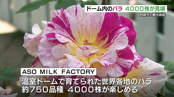 阿蘇市の「ASOMILK FACTORY(アソミルクファクトリー)」では、西日本最大級の温室ドームで育てられた世界各地のバラ、およそ750品種、4000株が鮮やかな花を咲かせています。