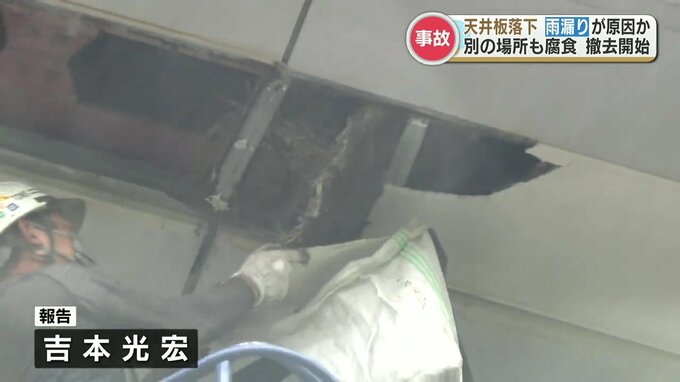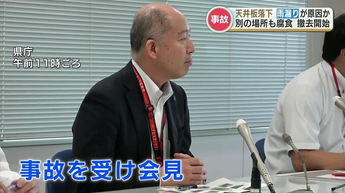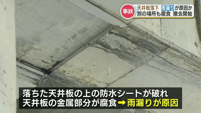 県によりますと落ちた天井板の上の防水シートが破れ、天井板の金属部分が腐食していたことから雨漏りが原因とみられるということです。