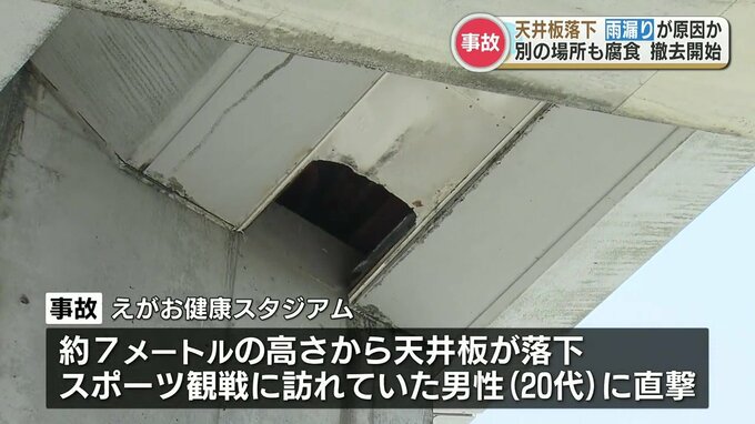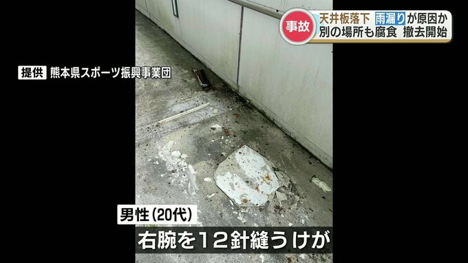 熊本市のえがお健康スタジアムで天井板の一部が落下し男性がけがをした事故、原因は施設の雨漏りとみられることが明らかになりました。
