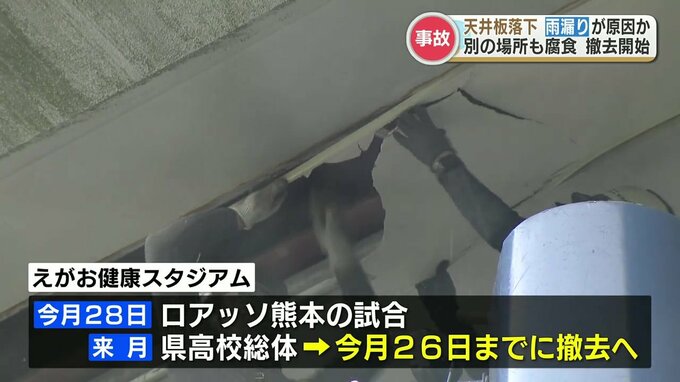 えがお健康スタジアムでは、今月28日にロアッソ熊本のホームゲームがあり、来月には県高校総体も控えていることから今月26日までに天井板の撤去を終える方針です。