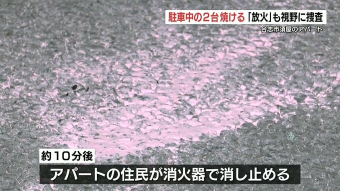 火は約10分後にアパートの住民によって消火器で消し止められましたが、停められていた軽乗用車2台のエンジン部分の周りが焼けました。