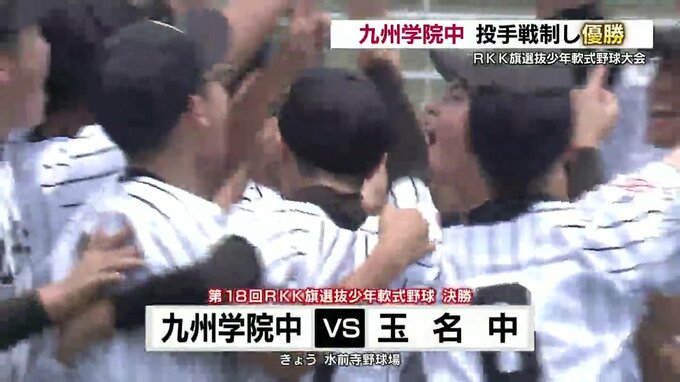 ハイレベルな投手戦 RKK旗選抜少年軟式野球 九州学院中学が制す 2023年6月3日(土) 18:36 国内 RKK旗選抜少年軟式野球大会は決勝戦。ハイレベルな投手戦の末、九州学院中学校が優勝しました。選抜された県内16のチームの頂点をかけ、九州学院と玉名が対戦。玉名の先発、エースの田上晴都(たのうえ・はると)…