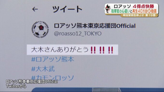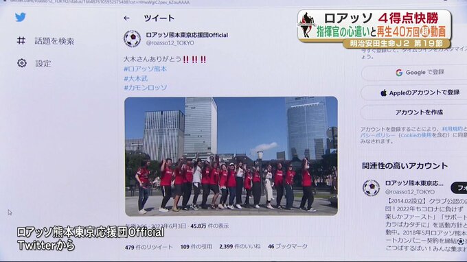 明治安田生命J2リーグのロアッソ熊本は、6月3日(土)の第19節で4ゴールを挙げ快勝。また、試合後に指揮官が見せた誠意に対してサポーターが応えた動画が再生40万回を超え大きな話題となっています。
