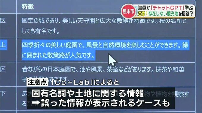 一方で、熊本市内の観光スポットについて質問をすると、「風の神の庭」など実在しない観光情報が含まれるなど、固有名詞や土地に関する情報については、誤った情報が表示されるケースがあることを指摘しました。