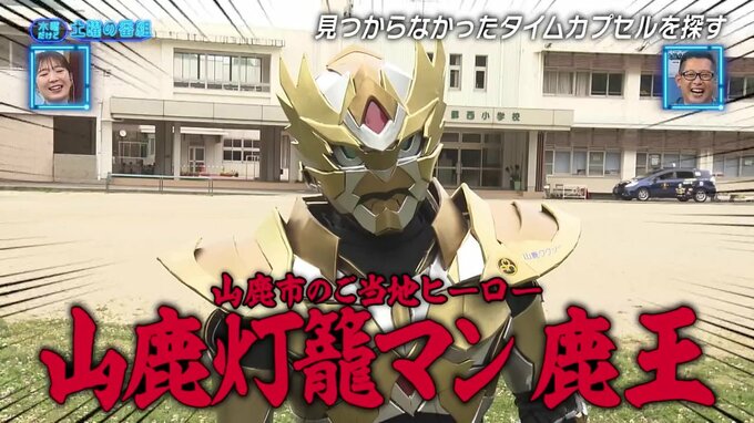 徳永さんに続いて、軽い感じで現れたのは山鹿市のご当地ヒーロー「山鹿灯籠マン・鹿王(がおう)」勇ましい装いの割には訛りとクセが強い。