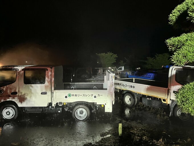 消防が駆けつけ、火は約1時間後に消し止められましたが駐車場に停めてあったトラックなどの車両16台のうち15台が焼けました。