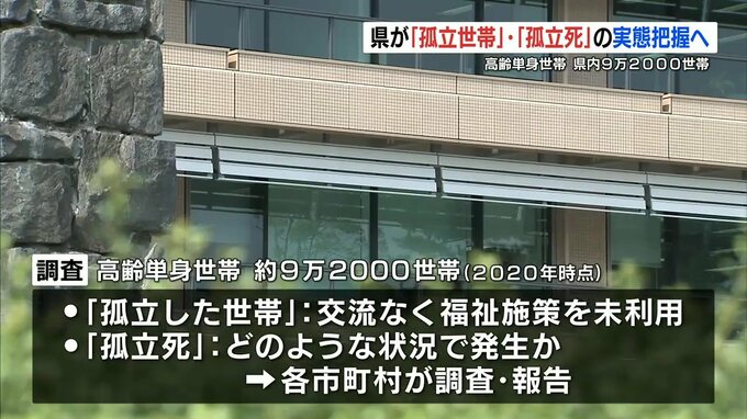 調査では、県内に9万2000世帯余りあるとされる高齢単身世帯のうち、親戚や地元住民との交流がなく、必要な福祉施策を利用していない、いわゆる「孤立状況」の世帯や「孤立死」がどのような状況で発生したかなどを各市町村が調べ、県に報告します。