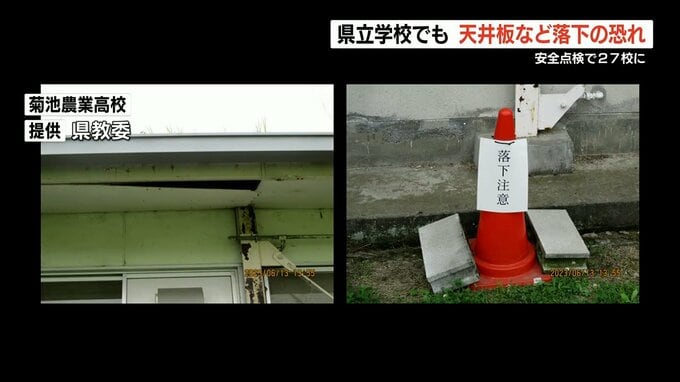 『天井板などの落下の恐れ』 県立学校施設を安全点検 27校で見つかる(全校名掲載)熊本 2023年6月17日(土) 12:24 国内 熊本県教育委員会は6月16日、安全点検の結果、27の県立学校で天井板などに落下の恐れがある箇所が見つかったと報告しました。この安全点検は5月14日、えがお健康スタジアムで天井板が落下し 男性がけがをした事故…