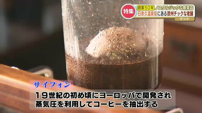 ヨーロッパの雰囲気漂う店内で淹れる一杯は、蒸気圧を使ってコーヒーを抽出する「サイフォン式」。