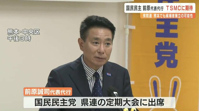 国民民主党 前原代表代行 衆院選 熊本での候補者擁立も 2023年6月25日(日) 18:02 国内 国民民主党の前原誠司代表代行が熊本入りし、TSMC熊本進出による経済効果の波及に期待を示しました。前原代表代行は国民民主党熊本県連の定期大会に出席し、日本経済の立て直しには賃金の底上げが必須と訴えました…