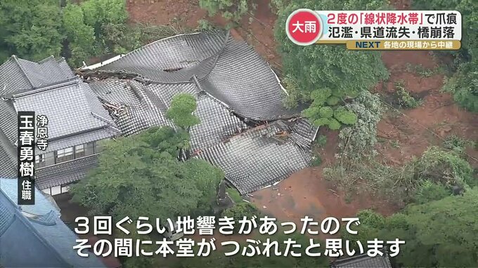 また、益城町赤井(あかい)の寺には裏山から土砂が流れ込み、本堂が倒壊しました。住民たちは、事前に避難していたということで、けが人はいませんでした。