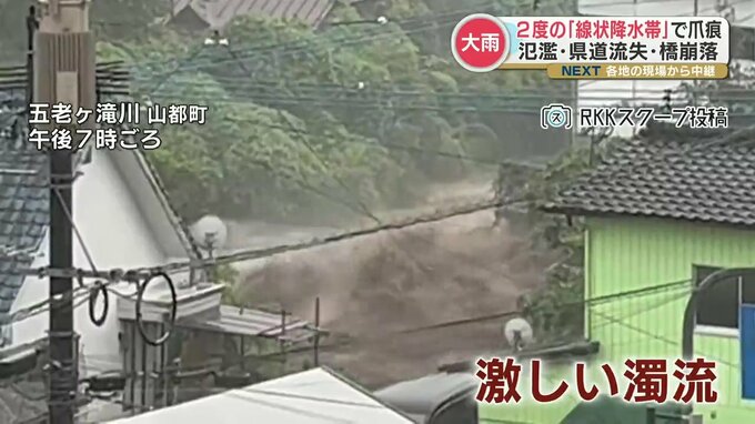 山都町(やまとちょう)の五老ヶ滝川(ごろうがたきがわ)の映像では、激しい濁流がしぶきをあげているのがわかります。
