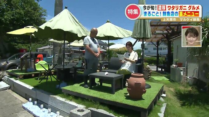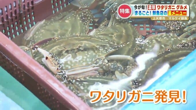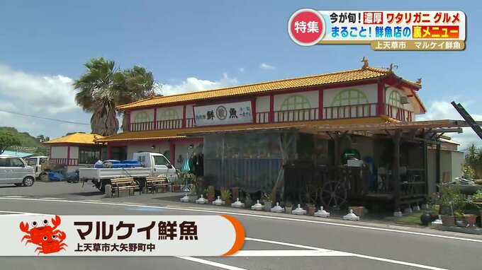 「ワタリガニ同様、これから旬を迎えたい(?)」という坂本くるみアナウンサーがやってきたのは、上天草市大矢野町。天草の海産物が揃う「マルケイ鮮魚店」です。